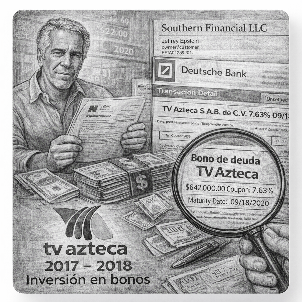 Documentos financieros contenidos en los archivos vinculados a Jeffrey Epstein confirman que el magnate estadounidense realizó inversiones en bonos de deuda de TV Azteca, S.A.B. de C.V., empresa propiedad de Ricardo Salinas Pliego, entre los años 2017 y 2018. La información, revisada por Sin Línea, detalla que las operaciones se realizaron a través de Southern Financial LLC, una de las entidades utilizadas por Epstein para la administración de su patrimonio, y que la relación fue estrictamente bursátil, sin participación accionaria ni control corporativo sobre la televisora mexicana. De acuerdo con el documento EFTA01289201, que incluye estados de cuenta y reportes de Deutsche Bank y Southern Financial LLC, en el apartado de Operaciones no liquidadas / Renta fija aparece de manera explícita la adquisición de instrumentos de deuda emitidos por TV Azteca. El registro señala la compra de un bono con cupón de 7.63 por ciento, vencimiento al 18 de septiembre de 2020 y un valor de mercado aproximado de 642 mil 682 dólares. La operación se cerró el 27 de octubre de 2017, con una pérdida neta de 3 mil 527 dólares; no obstante, al considerar los intereses cobrados, el retorno total fue positivo por 9 mil 406 dólares. El documento EFTA00604410 refuerza esta información al confirmar que dichos bonos no solo fueron adquiridos, sino también vendidos posteriormente. En el resumen de posiciones cerradas se repite el mismo instrumento financiero —TV Azteca S.A. de C.V. 7.63% 09/18/2020— con detalle del precio de compra, precio de venta, intereses percibidos y resultado final, lo que confirma que se trató de una transacción completa y documentada. Un tercer archivo, identificado como EFTA00604413, correspondiente a un consolidado de carteras de renta fija y variable, vuelve a incluir a TV Azteca dentro de las tenencias de deuda vendidas, con coincidencia exacta en cupón, fecha de vencimiento y entidad operadora, lo que corrobora la consistencia contable de la inversión. Por su parte, el documento EFTA00807456, un análisis consolidado de las entidades vinculadas a Epstein, no menciona directamente a TV Azteca, pero sí confirma que Southern Financial LLC, junto con la J. Epstein VI Foundation y Haze Trust, formaba parte del núcleo financiero utilizado por Epstein para gestionar su fortuna. Es la misma entidad que aparece ejecutando la compra y venta de los bonos de la televisora mexicana. Tras la revisión de los documentos, se concluye que Jeffrey Epstein no fue socio, accionista ni directivo de TV Azteca, pero sí figura como inversionista institucional indirecto en instrumentos de deuda de la empresa, mediante entidades bajo su control financiero. La operación se limitó al ámbito bursátil y no implica relación corporativa, administrativa ni de propiedad entre Epstein y la empresa mexicana.
